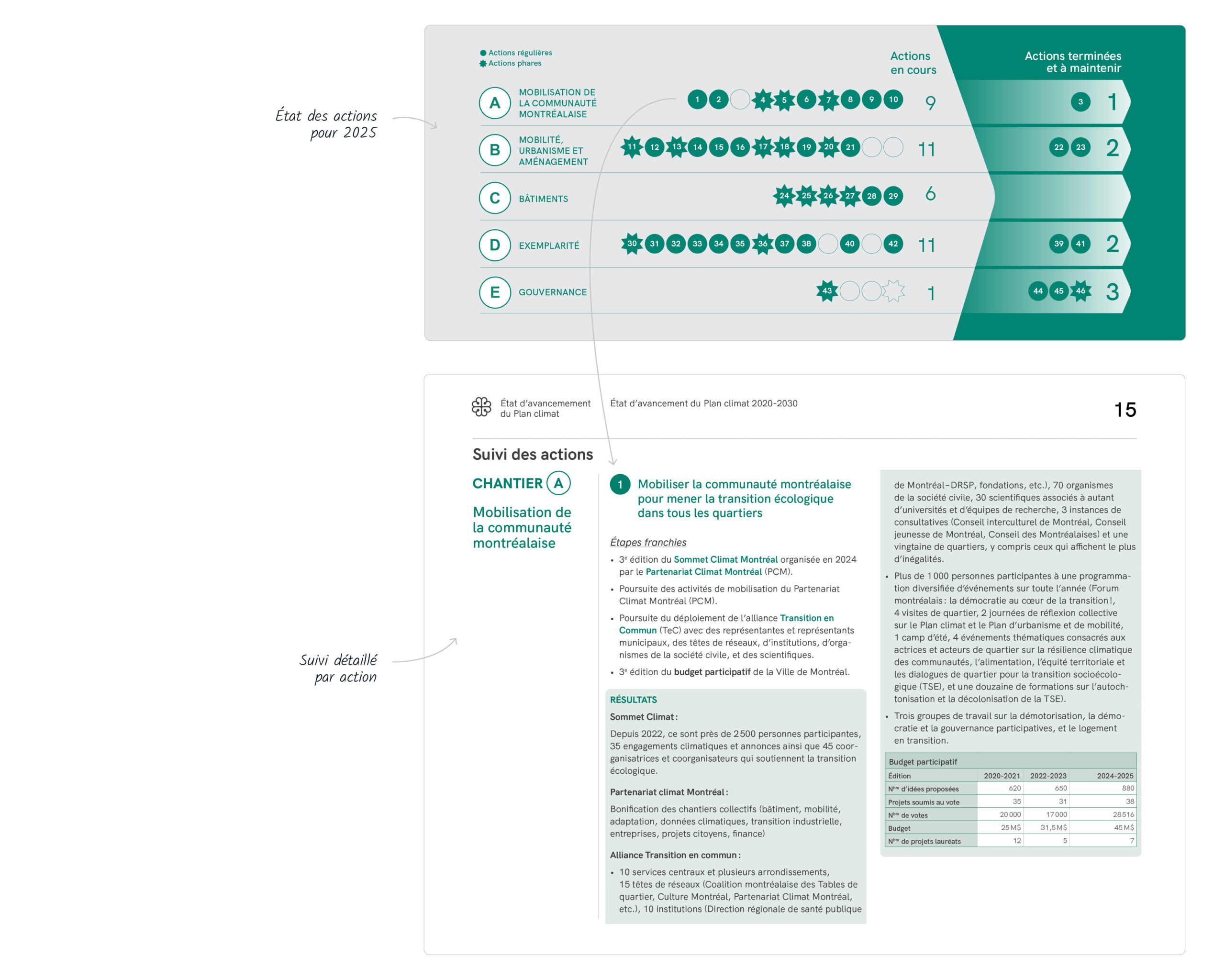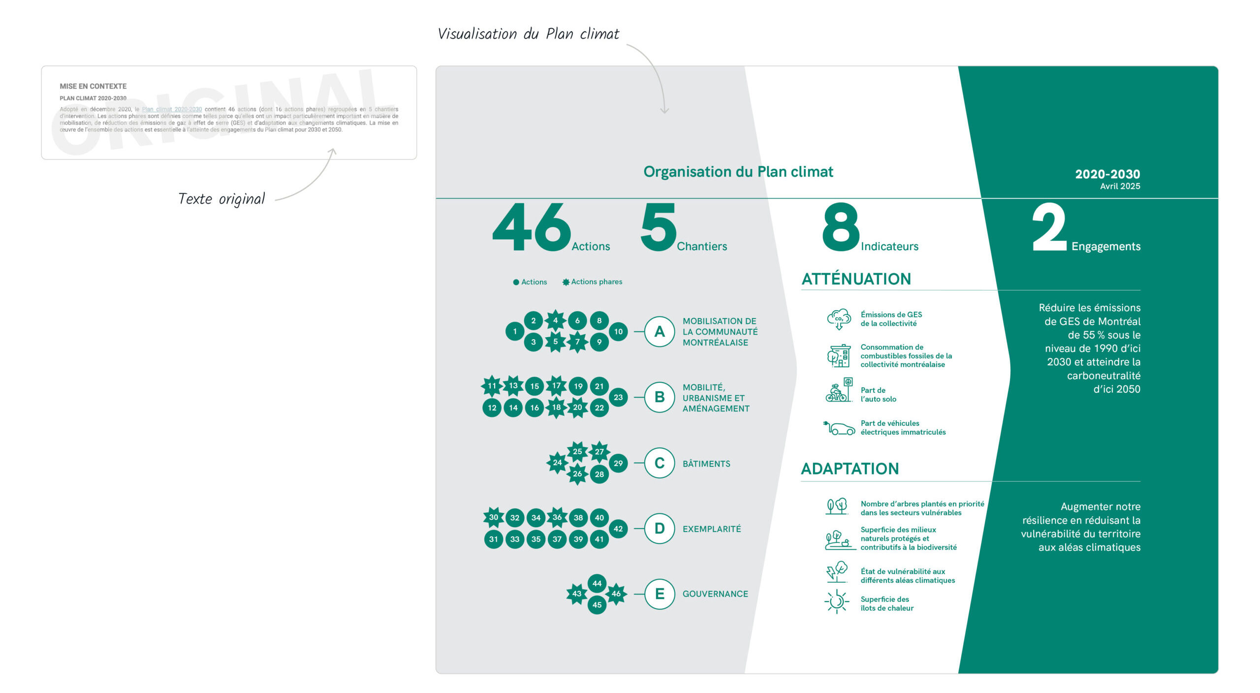 Nous avons adhéré aux normes graphiques du Plan climat 2020–2030 de la Ville de Montréal pour créer le rapport 2025. L’objectif était de développer des repères visuels inscrits dans la durée, qui permettent de nous guider vers le respect des engagements prévus pour 2030.